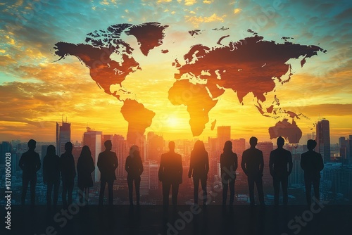 Diverse group silhouetted against sunset and world map, symbolizing global unity. AI generated illustration.