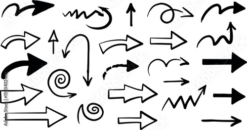 arrow, hand-drawn, collection, style, direction, diverse, graphic, design, art, vignetting, shape, variety, black, white, illustration, navigation, guide, pointer, symbol, simple, artistic, curved, straight, zigzag