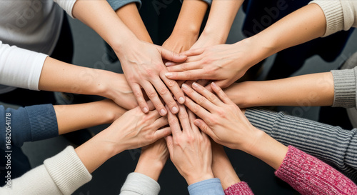 Diverse hands joined in unity symbolizing teamwork and collaboration. Togetherness, connection, solidarity, friendship, multiracial.
