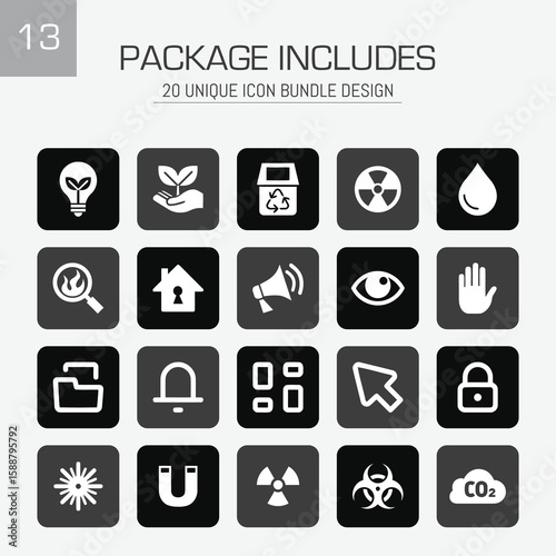 vector graphics, web design, digital artwork, graphic design, set, house, fire, folder, bell, atom, lock, hand, eye, droplet, light bulb, speaker, reusing, radiation