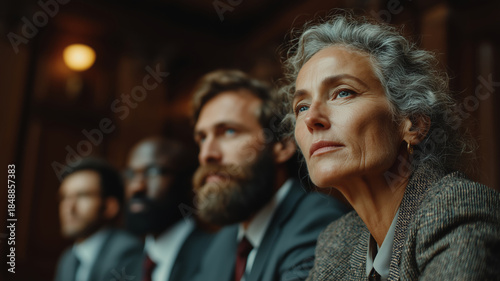 Diverse legal minds discussing in an elegant courtroom