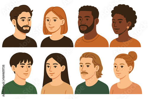 Diverse people portraits set. Men and women with various hairstyles and features. Multicultural character avatar collection for identity design. Vector illustration concept.