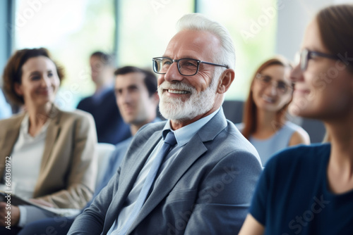 Diverse professional executive team working meeting in office. Mid to older aged business man manager leader talking to board people consulting partners.