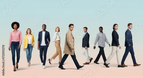 people, walking, diverse, professional, casual attire, clothing, young, suit, jacket, trousers, shirt, blouse, coat, jean, forward, gradient, background, outdoors, together, team, business, office, career, marketing, corporate, modern, bright, optimistic, confidence, communication, collaboration, success, progress, leadership
