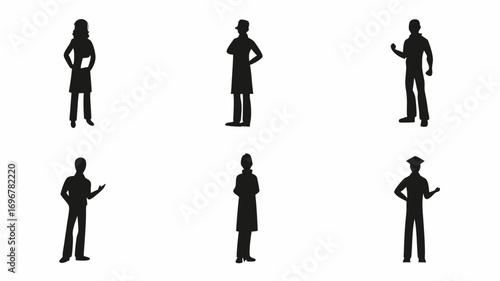 people, silhouette, professional, business, concept, modern, diversity, career, success, achievement, confident, person, group, collection, design, graphic, icon, symbol, element, set, illustration, male, female, woman, man, men at work, employee, manager, executive, student, graduate, teacher, presentation, gesture, pose, standing, white, isolated, simple, creative