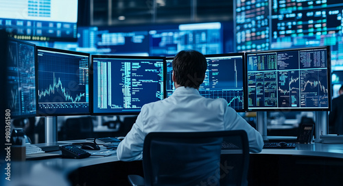 Diverse professionals in modern office intensely focused on complex database interfaces, competitive atmosphere with charts and graphs displaying performance metrics and real-time data analysis