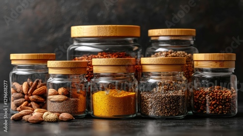 Diverse selection of spices in glass jars for flavor enhancement and culinary inspiration