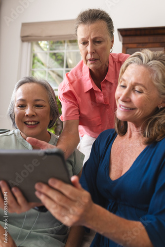 Diverse senior female friends sharing tablet at home, all smiling together