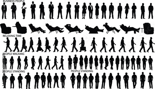 silhouette, vector, people, business, man, woman, walking, standing, relaxing, chair, collection, graphic, design, isolated, human, businessman, businesswoman, vector graphics