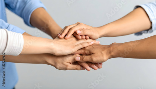 hand, hand, group, people, person, diverse, unified, human, professional, adult, casual attire, clean, stacking, supporting, joining, uniting, collaborating, collaborate, working, trusting, succeeding, blue, light blue, white, grey, beige, brown, colourful, oneness, trust, teamwork, support, togetherness, partnership, cooperation, success, community, solidarity, positive, harmony, connection, studio, indoor, closeup, soft light