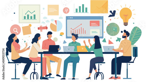 Diverse team at table with laptops brainstorming, surrounded by data charts, graphs, and creative ideas for collaborative solutions