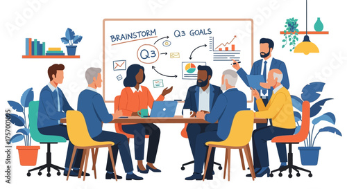 brainstorm, meeting, team, collaboration, discussion, planning, strategy, goal, business, office, work, teamwork, diverse, people, group, presentation, whiteboard, idea, analysis, chart, graph, progress, success, achievement, conference, seminar, workshop, training, communication, leadership, management, corporate, professional, modern, illustration, vector, design, flat, style, colourful, creative, graphic, concept, meeting room, table, chair