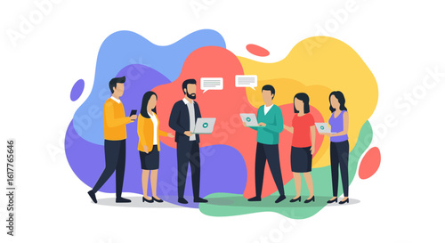 teamwork, collaboration, team, meeting, business, people, technology, laptop, smartphone, communication, diverse, colleague, office, modern, illustration, vector, graphic, design, colourful, background, abstract, innovation, creative, networking, connection, discussion, project, success, workflow, strategy, brainstorming, planning