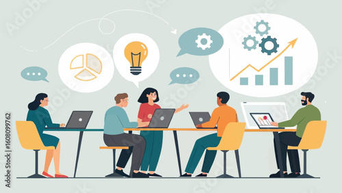 teamwork, collaboration, business, meeting, office, co-worker, colleague, brainstorming, idea, innovation, project, strategy, growth, success, planning, technology, laptop, computer, chart, graph, presentation, report, diverse, people, modern, illustration, vector, design, concept