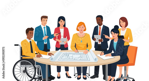 business, teamwork, collaboration, diversity, inclusion, planning, strategy, meeting, office, work, professional, modern, vibrant, dynamic, diverse, group, people, discussion, brainstorming, creative, innovative, productive, successful, tablet, blueprint, development, organisation, communication, cooperation, partnership, leadership, management, corporate, company, employee, co-worker, workplace, accessibility, wheelchair