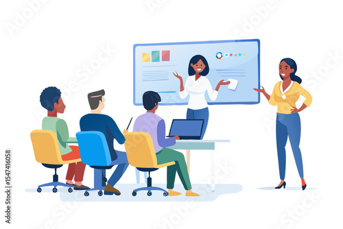 business meeting, teamwork, presentation, collaboration, office, workplace, strategy, planning, project, team, people, woman, man, graphic, datum, chart, laptop, modern, illustration, meeting room, corporate, discussion, brainstorming, professional, employee, colleague, feedback, idea