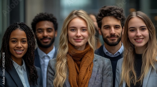 Diverse Team of Young Professionals Smiling Together in an Urban Setting