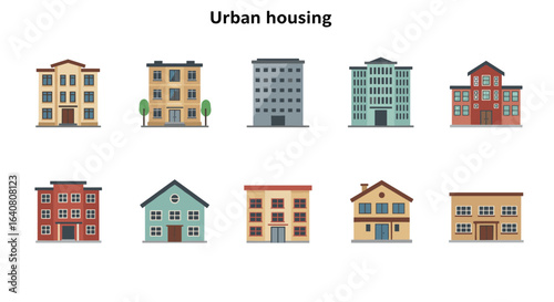 flat, urban, building, architecture, set, diverse, exterior, city, housing, apartment, residential, modern, colourful, facades, structure, development, neighbourhood, property, town, design, construction, community, real estate, tenement, symmetric, illustration, house, home, city landscape, architectural, metropolitan, variety, urban life