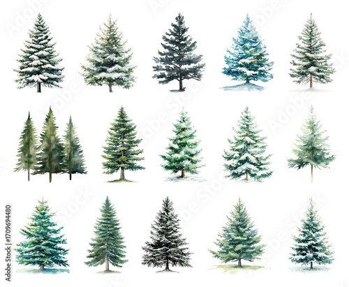 Diverse watercolor evergreen tree illustrations.