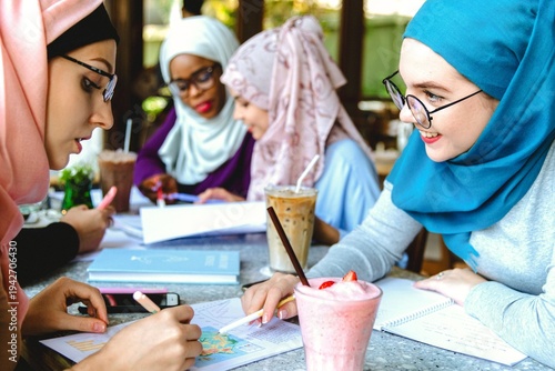 collaborating, woman, diverse, fashion, people, black, working, friendly, african, meeting, drink, photo, study, cafes, team, setting, african american, environment, photograph, teamwork, muslim, image, material, together, concept, multicultural, discussion, gathering, workspace, academic, casual attire, social, group, session, interaction
