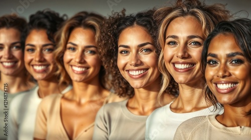 woman, group, diverse, standing, line, portrait, curly hair, wavy hair, straight hair, casual attire, fashion, style, oneness, diversity, togetherness, friendship, solidarity, empowerment, strength, beauty, natural, casual clothes, beige, white, brown, indoor, studio, young adult, middle-aged, light, medium, dark, female, sex