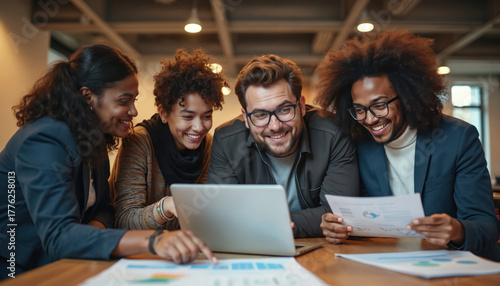 Diverse young business team works on laptop in modern office meeting room. Analyze data charts, brainstorm new ideas for startup growth. Colleagues collaborate on project with smiles, sharing