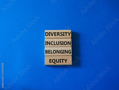 Diversity Inclusion Belonging Equity symbol. Concept words Diversity Inclusion Belonging Equity on wooden blocks. Beautiful blue background. Business concept. Copy space.
