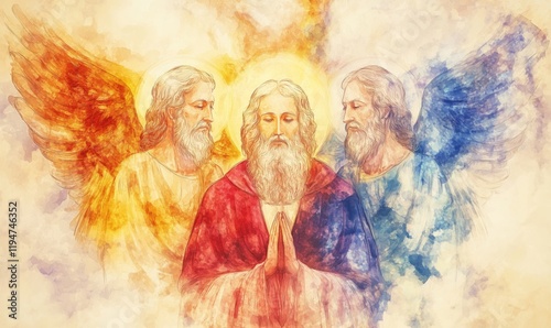 Divine Trinity Depiction with Three Angels in Watercolor Style, Radiant Colors, Spiritual Symbolism, Serene Atmosphere