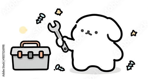 do it yourself, tool, fix, wrench, maintenance, dog, character, pretty, white, maneuvering, lifestyle, illustration, material, composition, working, pursuit, life, preparation, activity, do it yourself, hardware store, courteous, concentration