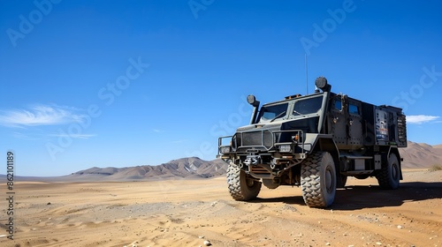 vehicle, armored, truck, military, desert, sand, sky, blue, transportation, equipment, machinery, technology, industry, combat, protection, security, tactical, camouflage, armored vehicle, warfare, battle, conflict, war
