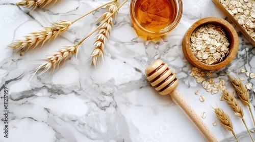 DIY detox face mask preparation, natural ingredients like honey and oatmeal on a marble countertop