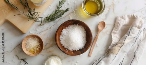 bricolage, hand, exfoliation, kit, sea salt, bathroom, countertop, natural, ingredient, olive oil, mixing bowl, spoon, skincare, spa, relaxation, wellness, treatment, homemade, scrub, marble, serene, wooden, lemon, jar, dropper, organic, health, beauty, pampering, environmentally friendly, salt, aesthetic