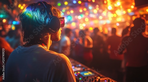 DJ at a vibrant nightclub, illuminated by colorful lights and surrounded by a lively crowd enjoying the music and atmosphere.