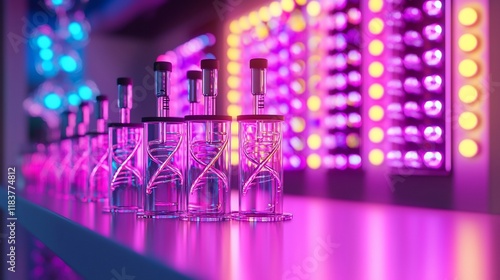 science, laboratory, research, deoxyribonucleic acid, genetic, biology, medicine, health care, technology, genetic engineering, biotechnology, pharmaceutical, experiment, analysis, discovery, innovation, treatment, development, progress, future, mobile phone, molecular, chromosome, helix, test, tube, ampoule, sample, fluid, liquid, purple, pink, neon, light, background, modern, clean, sterile, glasses, shiny, table, counter, wall, panel, colourful, vibrant, bright