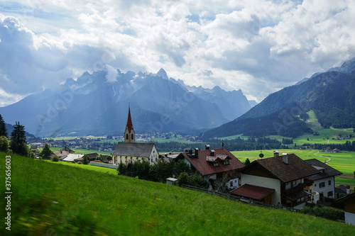 Dobbiaco Church in Val Fiscalina on a cloudy summer day, Dolomites, Unesco, Trentino Alto Adige, Sudtirol, Italy