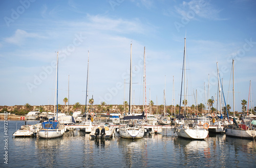 Docked ships at marine bay in a Spanish town. High-quality photo