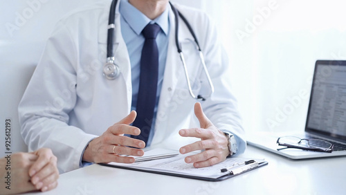 Doctor and a patient. The physician, wearing a white medical coat over a blue shirt and tie, gesturing with his hands during a consultation in the clinic. Medicine concept