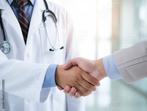 Doctor and Patient Handshake in Clinic.A close-up of a firm handshake between a doctor with a stethoscope and a patient in a clinical setting, symbolizing trust and agreemen