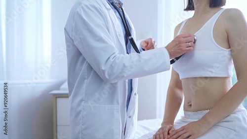 Doctor and patient. Physician is using stethoscope examining woman lungs in clinic cabinet. Medicine and health care