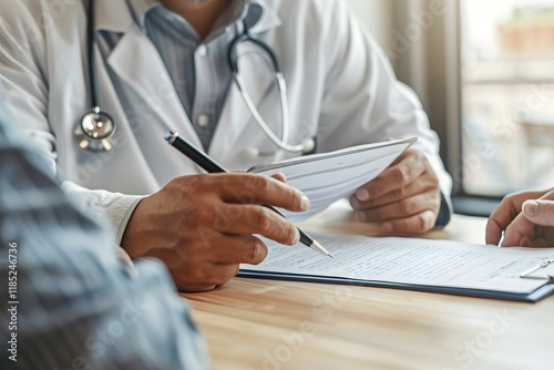 doctor, patient, white coat, stethoscope, pen, document, paperwork, medicals, office, health care, consultation, diagnosis, treatment, record, form, clipboard, hand, closeup, meeting, discussion, review, health, care, physician, exam, note, information, detail, prescription, appointment, check-up, file, paper, chart, table, wood, desk, setting