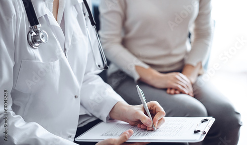 Doctor and patient sitting at sofa in clinic office. The focus is on female physician's hands filling up the medication history record form, close up. Medicine concept.