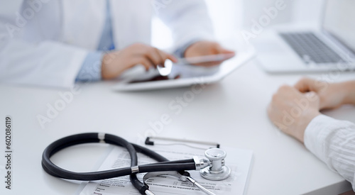 Doctor and patient sitting near each other at the desk in clinic. The focus is on female physician's hands pointing into tablet computer touchpad, close up. Medicine concept