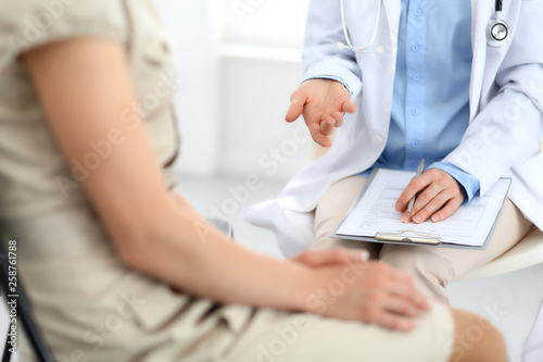 Doctor and patient talking. Physician at work in hospital while writing up medication history records form on clipboard near sitting woman. Healthcare and medicine concepts