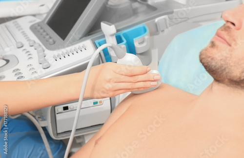 Doctor conducting ultrasound examination of patient's shoulder in clinic