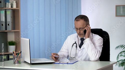 aid, call, calling, care, consultation, consulting, conversation, diagnostic, disease, doctor, health, health care, hospital, information, insurance, job, laptop, male, man, medic, medicals, medicine, occupation, office, online, patient, paediatrician, phone, physician, practitioner, prescription, profession, professional, result, smartphone, specialist, stethoscope, support, talking, technology, phone, test, healer, therapy, treatment, trust, work, workplace
