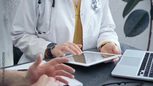 Doctor consulting patient with tablet and laptop. Healthcare professional discussing treatment options using digital devices. Medicine and health care concept