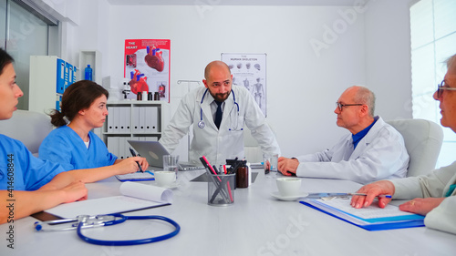 Doctor discussing with medical staff in hospital conference room wearing lab coat. Clinic expert therapist talking with colleagues about disease, diagnosis for patients treatment issues