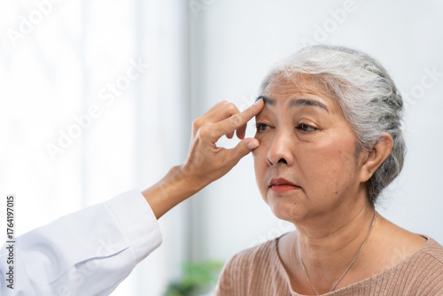 Doctor examining an elderly Asian woman's eye and eyebrow, focusing on healthcare, aging, and preventive medicine