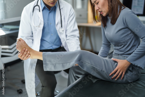 doctor, patient, leg, injury, medicals, exam, clinic, health care, pain, discomfort, treatment, diagnosis, professional, health, support, care, assessment, consultation, therapy, rehabilitation, assistance, medicine, hospital, recovery, orthopedics, specialist, physical, clinical, setting, visit, asian