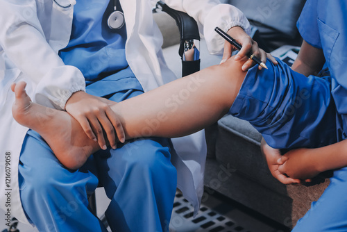adult, adults only, arthritis, assistance, athlete, bodycare, care, doctor, examining, exercising, expertise, hospital, disease, indoor, knee, leg, lifestyle, massaging, check-up, medicine, muscle, occupation, pain, patient, photo, physical injury, physical therapist, physical therapy, professional occupation, recovery, sport, stretching, support, two people, well-being, working